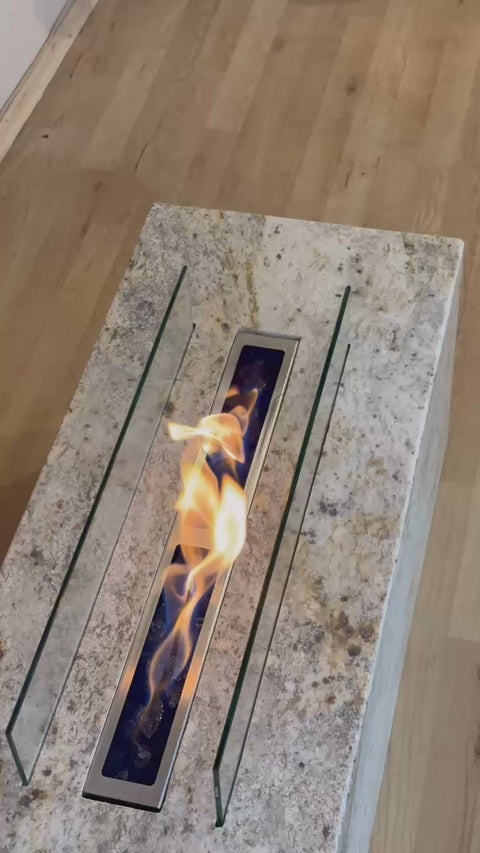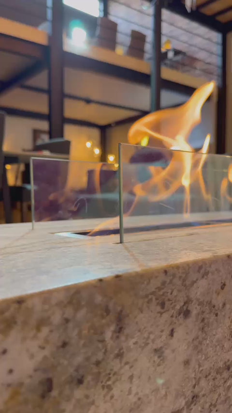🔳 Doble Cristal Templado: Esta versión chica de la chimenea "Ensenada" incluye dos cristales de vidrio templado a los lados, lo que realza su elegancia y sofisticación. Además, estos cristales protegen la llama del viento, mejoran la distribución del calor y brindan un extra de seguridad, sin obstruir la vista del fuego.